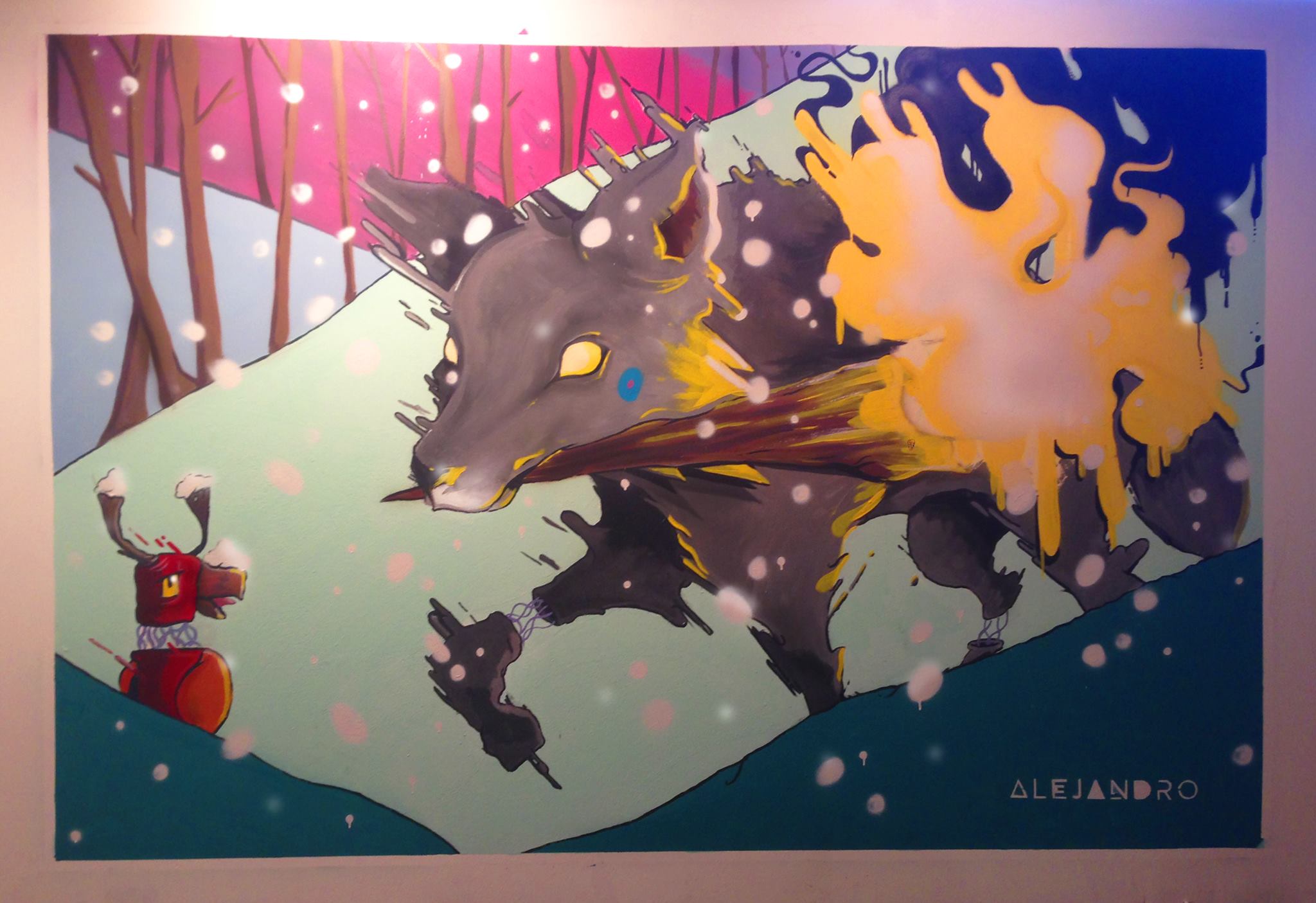 Alejandro: – Empecé de muy chico, inclusive antes de tener memoria. Tenía mucha imaginación y una necesidad de expresarme dibujando, pintando, modelando, lo que sea. Ese llamado del arte todavía es una necesidad y asumo que va a estar siempre en mi. Mi primer experiencia en el muralismo fue hace relativamente poco, en el 2015. Decidí cursar muralismo con Martin Ron, artista al que respeto mucho. Esa clase fue la que me acercó al muralismo y me explotó en la cabeza. A parir de ese momento no pude dejar de pensar en el muralismo como expresión y evolución del arte.