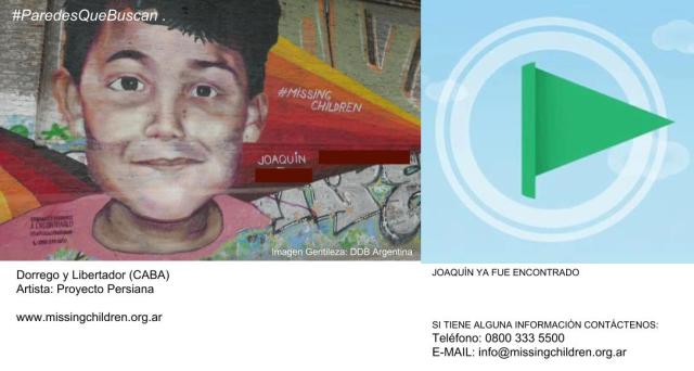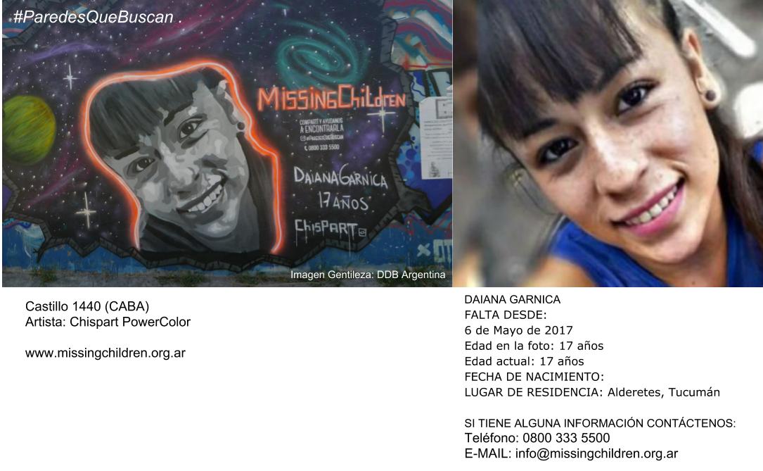 Una vez más las paredes y los muros hablan de las cosas que nos pasan. Las paredes nunca callan, la alegría o el dolor, la sorpresa o el enojo, la esperanza o el amor! En esta ocasión muros de la Ciudad de Buenos Aires fueron intervenidos por la Campaña #ParedesQueBuscan desarrollada para la ONG Missing Children, con el fin de continuar la búsqueda de chicos y chicas perdidos. A través de la viralización de estas obras de arte en redes sociales digitales, la campaña diseñada por la agencia DDB Argentina, continúa en plena vigencia para que vos también te sumes!