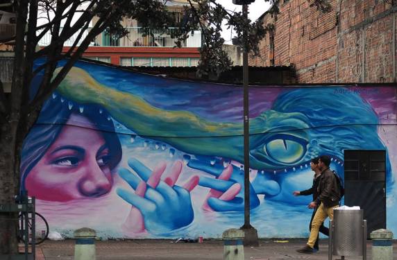 – Hoy en día tengo mis críticas hacia el realismo. Me cuestiono si está sobrevalorado, si presenta a la imagen ya muy masticada, generando un impacto que no invita a interpretar, limitando la profundización en el sentir al ver la imagen. Busco entonces el equilibrio en la totalidad del lienzo (muro), utilizando el realismo en los lugares necesarios, y aprovechando la potente capacidad de las texturas y grafismos de generar sensaciones y dinamismo. Con respecto al color, mi paleta lejos está de ser realista. En parte se define así a través de la intención de generar el clima mágico y onírico que realza al relato.