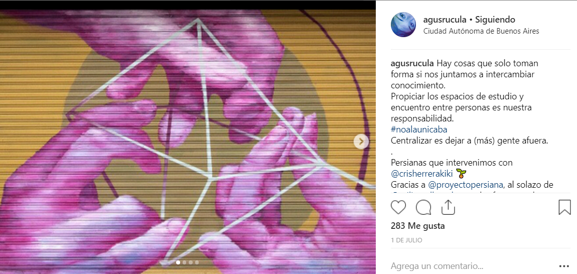 Agus Rucula es artista plástica, cursó Bachiller en Comunicación, Arte, Diseño y Técnico en Artes Visuales en Polivalente de Arte de San Isidro. A nivel terciario cursó Diseño Industrial en la Facultad de Arquitectura, Diseño y Urbanismo (UBA) y realizó diversos cursos de plástica, arte, creatividad, ilustración y carpintería. Desde el año 2012 realiza murales en el espacio público tanto autogestionados como por encargo, para festivales o instituciones privadas. Participó en diversas intervenciones internacionales en espacios públicos en Argentina, Colombia, Ecuador, Perú y Uruguay. Y participó en Festivales de arte mural en ciudades locales: Proyecto Persiana (Buenos Aires, Rosario y Saldías), Varieté Astrolabio y Circo Liberatta (Saladillo), Festival Independiente Maravillosa Resistencia (Saladillo), -Encuentro de Arte Urbano Atrapasueños Vuelve Al Barrio’ (Mar del Plata), 3er Encuentro Nacional de Muralismo y Arte Público, Ashpa Sumaj Salavina (Salavina, Santiago del Estero), AUCH Sin Fronteras (Artistas Unidos Chascomús), El futuro está en juego – Encuentro de Muralismo y Arte público (Barrio La Bajada, Rosario), Color B.A. Edición Reconquista, Maneuyac (encuentro de Muralismo en Barreal, San Juan), Pinta tu Barrio (Quilmes). Y festivales internacionales, Pintó La Teja (Montevideo), Bogotá Graffiti & Friends (Bogotá), Festival Atrapasueños Lozano y Lozano (Bogotá), Pinta la Buitrera (Cali), 1er Festival Internacional de Muralismo (Mosquera), Festival Ñatinta (La Paz). Y como coordinadora en diferentes proyectos artísticos: Día del Agua: Cuidado de la Fauna del Río Subachoque – mural en acueducto (evento junto a Alcaldía de Madrid, Cundinamarca, Colombia), Coordinación mural para personas con capacidades diferentes, organización ‘Colorinche’ (Buenos Aires, Argentina), Proyecto y coordinación Mural en Jardín de Infantes Nº2 junto a ‘Pasan Cosas Carapachay’ (Vicente López, Argentina). Es docente de Dibujo en el Ciclo Básico Común de la Universidad de Buenos Aires (Ayudante en Cátedra Espina) y ha dictado varios talleres de arte, pintura, dibujo, ilustración, técnicas del color y muralismo en diversas instituciones.