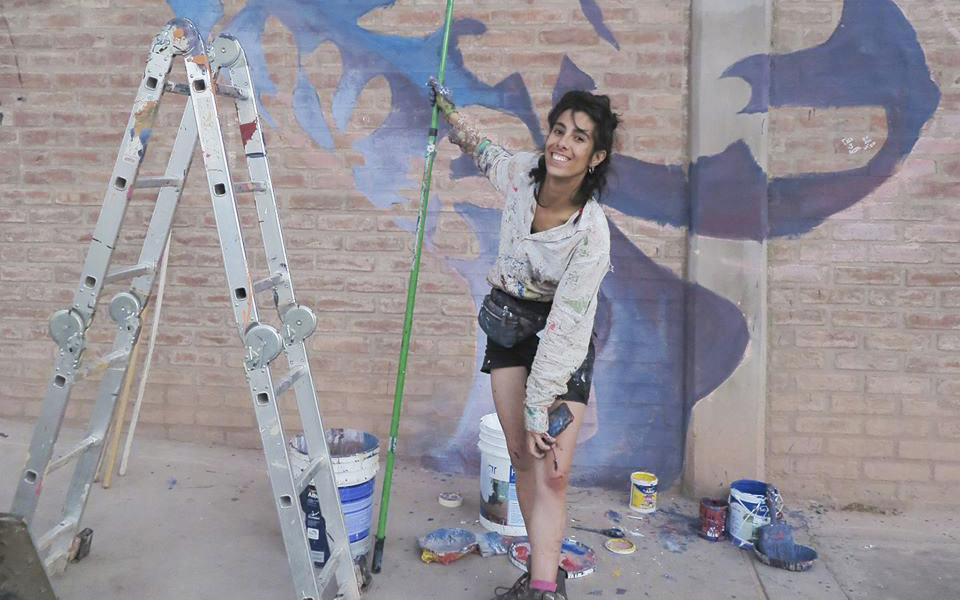 – Fusionar pintada con otro artista es un gran desafío plásticamente. Con Cris tenemos mucho en común en cuanto a lo que elegimos relatar y de qué manera. Es todo un logro encontrar el punto en que podemos complementarnos, sin competir y potenciando nuestra obra a través de lo que surge al unirnos. Pintamos juntos en tres ediciones de Proyecto Persiana, en un muro en Cuzco, en el festival Ñatinta en La Paz, en Barreal y en trabajos particulares en Buenos Aires y en Salta Capital. El aprendizaje es constante y en lo personal creo que trasciende lo profesional, abordando ya temas humanos. En un presente donde el arte urbano está tan en auge, es clave intercambiar reflexiones entre colegas porque eso nos hace crecer, y con él profundizamos y pulimos mucho nuestras posturas como artistas callejeros. Participar activamente en AMMurA (Agrupación Mujeres Muralistas de Argentina) también me permitió abordar temas que transitamos desde lo individual pero que atraviesan a todo muralista.
