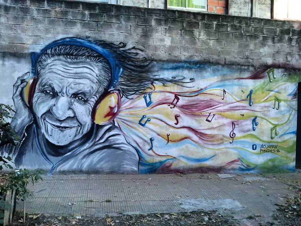 – Bueno, saber lo que piensan y sienten es complicado… pero con respecto a lo que sienten algunas personas cuando estas pintando, son variadas las reacciones. Te saludan, te traen café, o te compran una gaseosa, se sacan fotos con la obra, con los artistas, te tocan bocina desde los vehículos, te cuentan anécdotas referente a lo que elegiste para pintar (si es algún personaje conocido) también te gritan (como me paso)…”eeh ameoo píntate al gauchito gil!!” o te piden determinado músico, personalidad destacada, se acercan a agradecerte porque los sacas de su monotonía diaria. O en el mejor de los casos te dan un abrazo y eso es muy fuerte en estos días, que dos perfectos desconocidos se estrechen en un abrazo. Eso es lo que tiene de maravilloso el arte en la calle… que genera muchas emociones en la gente y te la hacen saber. Es algo que tanto a mí como a mis colegas nos pasa cada vez que encaramos una obra en la vía pública.