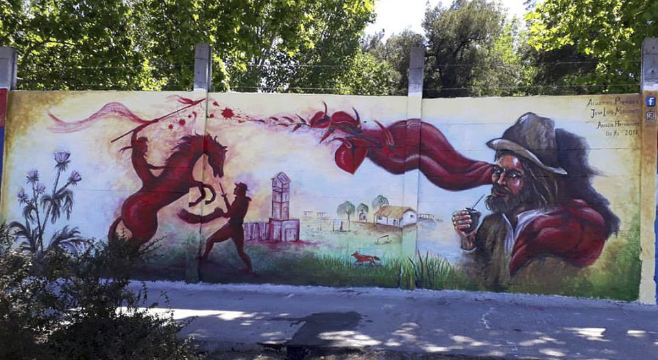 Siempre hay una anécdota con cada mural… la que viene a mi cabeza ahora es la que se dio cuando estaba pintando el año pasado para el Festival Internacional Martín Fierro en la localidad de San Martín, pintábamos un tema alegórico al Gaucho Fierro sobre el paredón del Liceo militar (situado frente al Hospital Castex), cuando siento bocinazos y alguna que otra puteada en la ruta, más de lo frecuente, al darme vuelta, por los gritos que sentía, veo al camionero que frenó el vehículo parando el tránsito para sacarle una foto al mural y a los gritos de…. “ Eehh gracias loco por esto hermoso que están haciendo, embellecen el paisaje, pero sabes una cosa?, le falta algo muy importante para que quede mejor (Uhy pensé, qué se nos pasó por alto con respecto a la gesta gauchesca de José Hernández…) Qué cosa?, le grité… y subiéndose a su camión nos dice…el escudo y los colores de Chacarita Jr. Papaaaá!!” Fue muy desopilante toda la escena… jajaja
