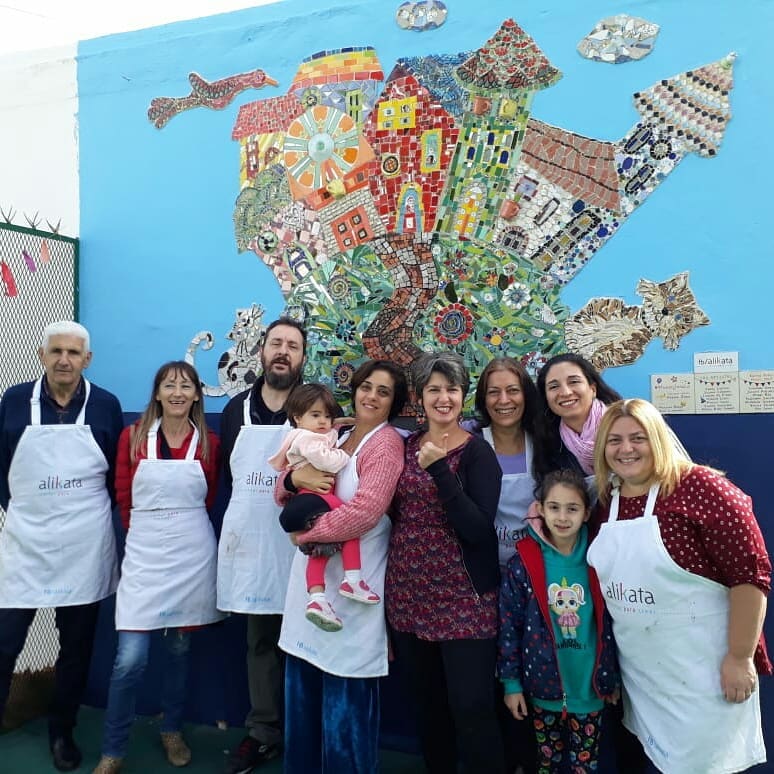 En Alikata se trabaja el mosaico de forma más bien pictórica. Utilizando todo lo que tenemos a mano, reciclando y resignificando objetos muchas veces muy simbólicos para quien los dona. Es una actividad 100% resiliente ya que se construye desde lo roto resignificándolo.