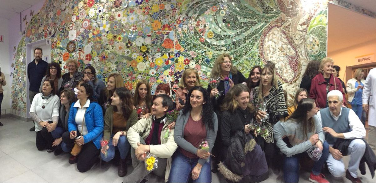 A medida que fui entrando en esta actividad, tomando cursos etc., me fui involucrando con distintos artistas y grupos de difusión del mosaico como actividad. De esta manera me enteré de una convocatoria para realizar murales en todo el país en homenaje al Dr. René Favaloro donando corazones para un mural. Esa fue mi primer experiencia del taller en un proyecto colectivo sumándome en la colocación de un mural que se colocó en el hospital Piñero en julio de 2016.