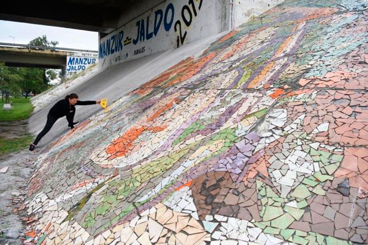 En tiempos de elecciones las paredes hablan. En uno de los accesos de la ciudad, camino a Alderetes y al aeropuerto Benjamín Matienzo, la base del puente de la autopista de Circunvalación está tomando color, pero no con propagandas políticas pintadas con base blanca de cal y brocha gorda. Desde el jueves miles de pedacitos de cerámicos están siendo pegados uno por uno para formar un mural.